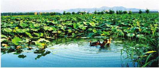 旧时济南,城北一片辽阔。府城及圩子城中的众多泉水,汇流为东、西泺河等水系,一路北行,将这片沃土滋润成烟波浩渺的湖泊,直抵鹊、华二山脚下,人称鹊山湖,湖中荷花连连,遂有莲子湖之别名。唐代段成式《酉阳杂俎》载:“历城北二里有莲子湖,周环二十里,湖中多莲花,红绿间明,乍凝濯锦。”
