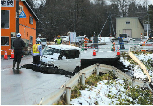 12月9日在日本青森县东北市拍摄的一辆停在塌陷路面上的车。  新华/法新