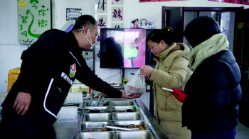 中午十二点多,用餐高峰渐过。张艳君仔细打包好两个热乎的包子,准备给6号楼一位出行不便的老人送去。针对部分老人出门困难、尤其是天气寒冷的情况,食堂提供送餐上门服务,尽可能为老人提供便利。