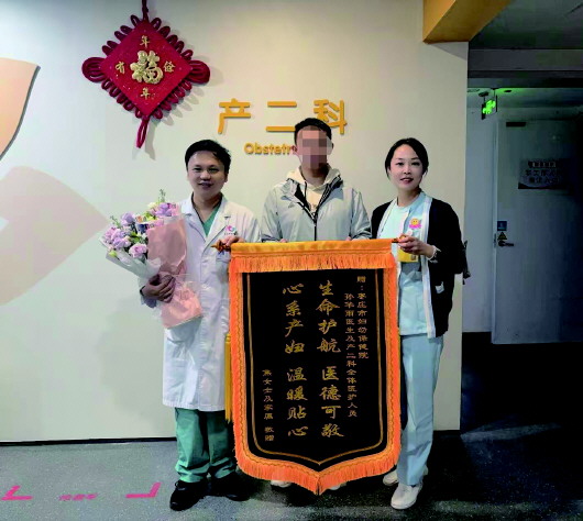 如今,焦女士和家人送来锦旗和鲜花:“这面锦旗,是为您‘不变的守护’而献上”。锦旗上烫金大字写着的“生命护航医德可敬,心系产妇温暖贴心”,见证的不仅是两个新生命的平安降临,更是医患之间沉淀多年的信任与温情。