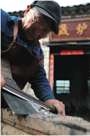 郝纪迎15岁就开始独自闯荡,他和姐夫推着小车,走街串巷补锅、磨刀、修农具。支起摊子,小锤一敲,本以为能吸引众人,可村民们一见是“小郝”而不是“老郝”,便纷纷带着农具离去。父亲告诉他,技艺虽好,但要赢得信任,就像种地,得先养好地,才能有好收成。郝纪迎没有气馁,他继续蹲守了一个月,凭借精湛的手艺修好了几个农具,逐渐赢得了乡亲们的认可,就这样“一传十,十传百”,生意慢慢多了起来,这一干就是50多年。