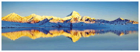 六点开始,天色开始变化,湖山慢慢由淡蓝到浅红,再到金黄,原来银装素裹的贡嘎主峰,完全是另一副模样。一轮圆月在它的上方,真是仪态万方,荣耀华贵。一刻钟不到,光淡了,暖色退去,一层蓝色笼罩下来,山和湖覆上了厚厚的冷调。