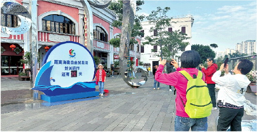 12月17日,在海南省海口市骑楼老街北门广场,游客和海南封关倒计时展牌合影。 记者 尹睿 魏银科 摄