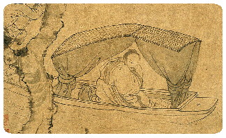 张渥的《雪夜访戴图》现藏于上海博物馆。该作全幅构图简洁,主题突出,与其他“访戴图”不同的是:画面舍弃了雪景、山水的渲染,主体部分仅留一树、一舟与一人而已。河岸古树枝干虬劲,或浓墨渲染,或淡墨勾勒,营造出冬夜寒寂的意境。作者集中笔墨描绘王徽之的人物形象,造型准确,仅寥寥数笔,将人物刻画得惟妙惟肖。王徽之坐于船篷内袖手读书,人物在眉目之间显露高傲与郁郁不欢之态。作品沿用李公麟白描传统,人物衣纹以细劲铁线描勾勒,树石线条富于粗细浓淡变化,通过人物神态与环境的对比烘托出隐逸之士的情怀。从整体的气氛到苍劲的古树、形单影只的小舟,再到形态迥异的撑篙人和读书者,毫无违和之感。画面有意侧重描绘主人翁双手拢袖,一株脱尽树叶的寒木,船夫以袖裹篙撑船行进,以衬托雪夜寒意的情景。该作表现出画家高超的笔墨技巧和深厚的艺术功底,实为他生平倾心之作。