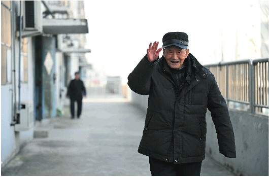 天气晴好的时候,李明山老人走出家门遛遛弯,见到熟人邻居老远就打招呼。