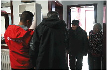 工人们正在给家里安装孙子给他们买的空调,老两口忍不住出来看一看。