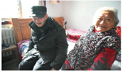老伴帮着李明山捶捶背,俩人镜头前笑得合不拢嘴。