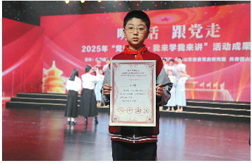 近日,由山东省关心下一代工作委员会、山东省教育厅、中共山东省委党史研究院、共青团山东省委主办,山东教育电视台承办的2025年“党史国史·我来学我来讲”活动成果展演在山东教育电视台演播厅举行。济南市莱芜陈毅中学40级16班学生周润泽凭借原创作品《15号信箱的秘密》斩获三等奖,并作为全省获奖学生代表登台亮相,展现新时代青少年坚定信念跟党走的精神风貌(右图)。