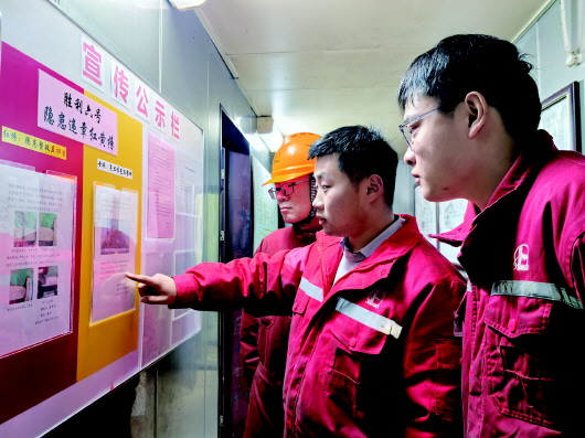 12月23日,胜利石油工程海洋钻井公司胜利六号平台的公告栏前,刚换班的员工驻足观看最新一期“隐患违章红黄榜”。水手庞华伟因在安全隐患“回头看”中表现突出,其名字被张贴在醒目的“红榜”区域,成为大家学习的榜样。