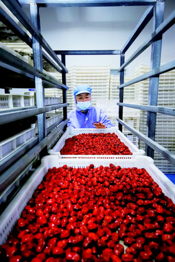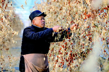 12月18日,农民在乐陵市金丝小枣双新双零精品示范园大棚内采收金丝小枣。 张鹰 摄