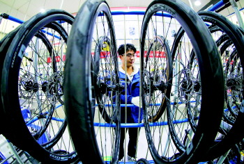 12月18日,在位于乐陵市的泰山体育产业集团有限公司,工人在组装线备料。 张进刚 摄