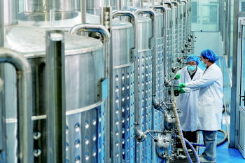 12月19日,在位于乐陵市的山东省健康食品研发创制与检验检测中试示范基地,技术人员对蒸馏设备中的黑枣酒进行取样。 唐克 摄