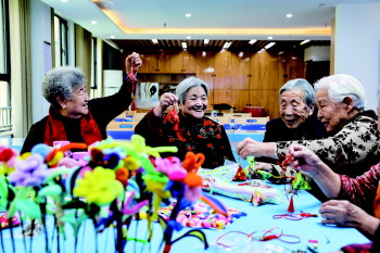 12月19日,在乐陵市德乐怡嘉长者公寓,老人们在开心地制作福袋包。 贾鹏 摄