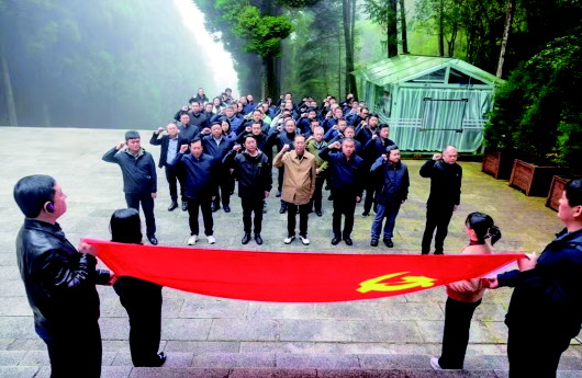 井冈山革命烈士陵园,109级台阶前,学员整齐列队,整理着装。一步一阶,仰望群峰,拾级而上。烈士纪念堂前,全体学员面向鲜红党旗,高举右拳,重温入党誓词,铿锵誓言回荡山间。6名年轻干部深情诵读《我的祖国》,以青春之声致敬先烈、告慰英雄:“我的祖国,高山巍峨,雄伟的山峰俯瞰历史的风狂雨落……”