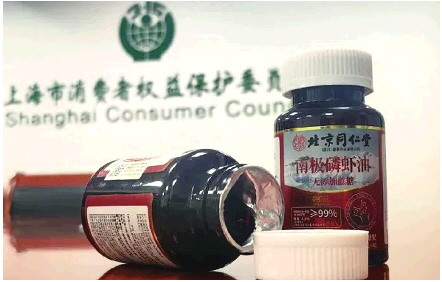 一款标称“北京同仁堂99%高纯南极磷虾油”的产品,宣称磷脂含量达43%,经上海市消保委实测结果却为0。涉事生产商为北京同仁堂(四川)健康药业有限公司,其母公司中国北京同仁堂(集团)有限责任公司随后发布声明,责令下架涉事产品。然而,记者调查发现,同款产品仍在部分电商平台售卖,包装标注“俄罗斯进口”。但用户评价晒图实为北京同仁堂(四川)健康药业有限公司出品的南极磷虾油凝胶糖。