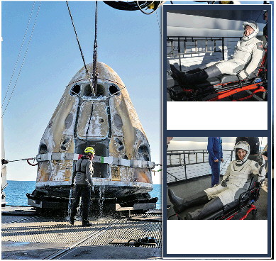 美国东部时间3月18日1时05分(北京时间18日13时05分),“龙”飞船脱离国际空间站启程返航。经过近17个小时飞行后,飞船于美国东部时间3月18日17时57分(北京时间19日5时57分)在佛罗里达州近海溅落并被安全回收,在太空滞留了9个多月的威尔莫尔和威廉姆斯终于回到地球。