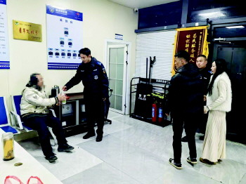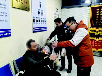 确认男子身体无碍后,民辅警将其扶进警务站休息,递上热水,陪他进食。
