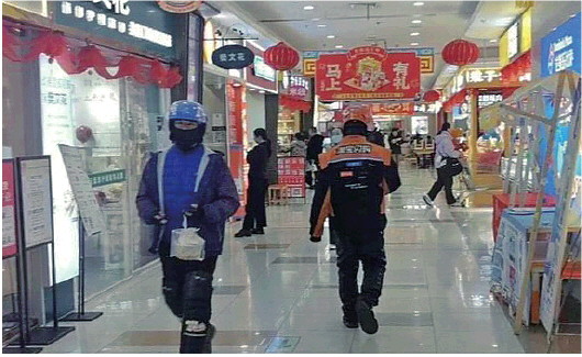 2025年末,在历下区某商超,两名外卖骑手擦肩而过。
