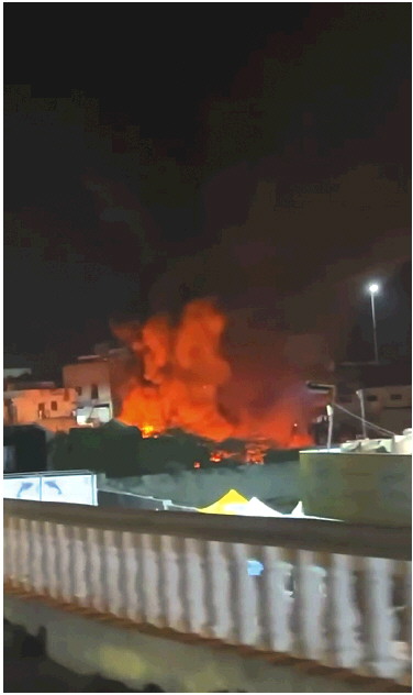 2025年12月30日,在也门哈德拉毛省穆卡拉港,空袭引起大火。 新华社发