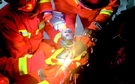 消防员一边安抚老人,一边做好防护措施,果断使用无齿锯小心翼翼地将卡住手指的门板局部切割分离,随后利用角磨机、尖嘴钳等工具对部件进行精细破拆。