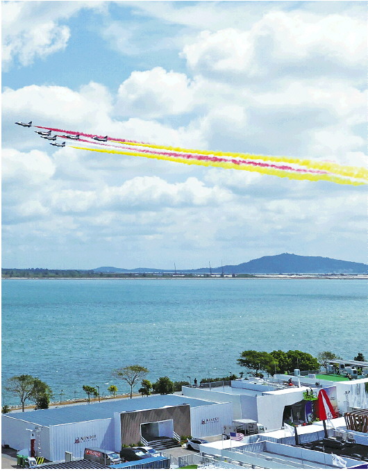 1月30日上午,中国空军八一飞行表演队在新加坡樟宜机场海面上空展开空中特技动作飞行。
