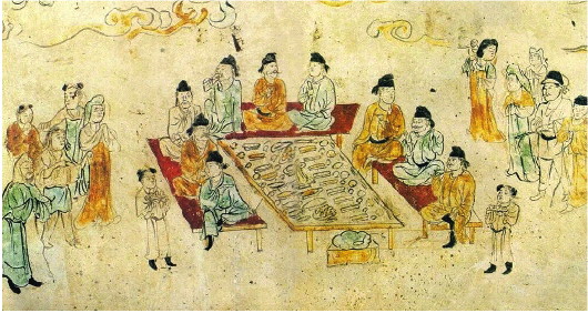 吃饭时最重要的是饮酒。不过古代一般先吃饭,后饮酒,和今天边饮边吃或者先饮后吃不同。唐代传奇《虬髯客传》里说,李靖带着红拂女去拜访虬髯客,虬髯客请吃饭,吃完饭才开始行酒。