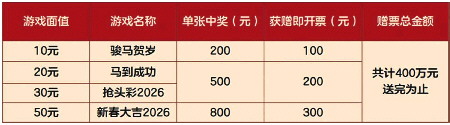 本次活动将持续至2月19日,活动期间,凡在山东省内体彩实体店购买上述四款马年生肖主题即开票,单张中得指定金额,即可现场获赠相应价值的即开票。一份幸运,双份喜悦,让您的新春好彩头“马”上叠加。活动具体内容如下: