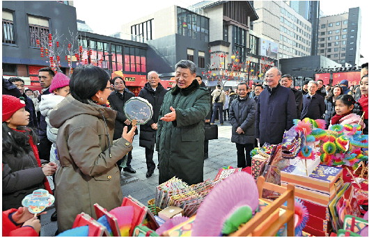 正值农历小年,隆福大厦前,新春市集吸引了大量市民和游客。习近平饶有兴致察看各式年货摊位,同现场群众亲切交流。他愉快地向大家讲起年少时多次到隆福寺的情景,还购买了几份特色食品和文创产品。
