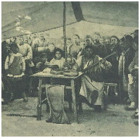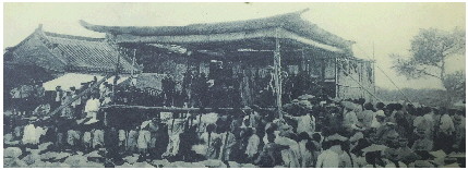 除了唱戏的,李村大集上还有一些说书、唱大鼓的。这些人靠卖艺为生,“说书篷内,约可容纳五六十人,篷内中间摆放一桌子,桌上放有鼓架和书鼓,桌旁一条长凳,供伴奏人坐着,桌前的桌撑处挂有一个褡裢,是收钱的口袋。听书人围站在四周,全神贯注在听。”“说到精彩之时,便会卖个关子,戛然而止,抱拳作揖求列位看官赏钱。听者便纷纷解囊,把随身所带的钱币扔进桌前的口袋里。说完一段,要清场一次。待人散尽后,再重新张罗着开场,每逢集日,可说两三场。也有不清场的,每说一段,手持钱箩绕场收钱一次。”