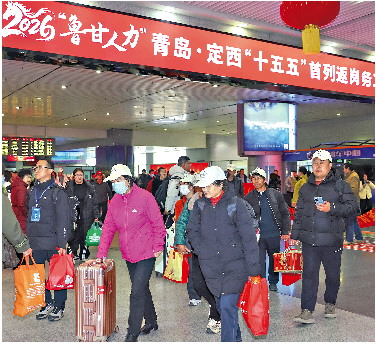 此趟专列是2026年山东省首趟东西部劳务协作返岗务工专列,也是青岛连续第六年以“专列之约”迎接定西乡亲,今年返岗专列的服务再度升级。一是岗位供给精准扩容。春节前,人社部门深入企业一线摸排用工需求,归集高端制造、新兴产业等领域优质岗位8000余个,部分技术岗位月薪可达万元以上,为务工人员提供更多高质量选择。二是前置服务细致暖心。依托“青定人力”劳务协作机制,两地人社部门打破地域阻隔、提前联动,线上开展岗位推介、远程面试,帮助务工人员在返岗前就完成岗位匹配,减少盲目流动;线下提前谋划做好务工人员返岗“点对点、一站式”保障,提供岗前技能培训、入职指导等闭环服务,助力务工人员快速适配岗位、融入青岛。三是稳岗成效持续凸显。青岛持续加大对定西来青务工人员扶持力度,开展针对性培训,助力务工人员从“普工”向“技工”转型,不断提升就业竞争力;同时强化人文关怀与权益保障,用心解决住宿、子女入学等实际困难,让务工人员真切感受到城市温度。今年返岗人员中,老员工占比超六成,不少已成长为企业技术骨干,部分务工人员在青岛安家落户,真正实现“一人就业、全家增收、扎根城市”的美好愿景。