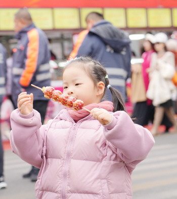 糖球会现场,小朋友吃糖球。