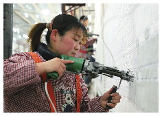 工人在车间里进行“枪刺”编织。