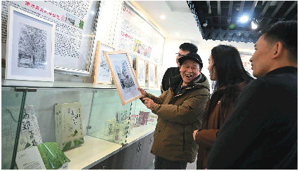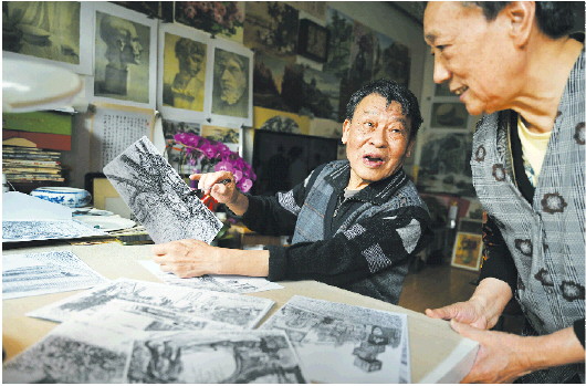 在槐荫区文化馆,陈永立老人正在讲述他的钢笔画背后的故事。