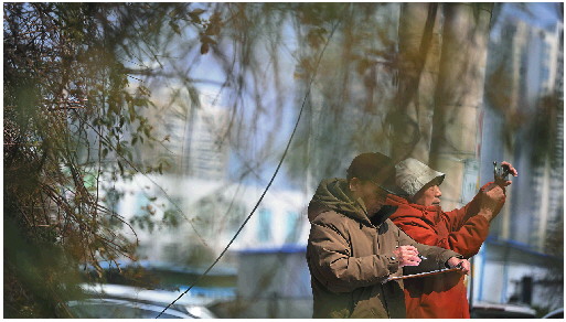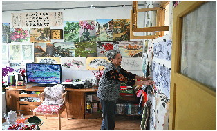 陈永立将刚画好的画拿给老伴看,老伴刘金兰是他最忠实的观众。