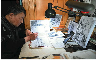 3月10日,家住济南槐荫区营市东街的陈永立伏案窗前,用手中的中性笔一笔一划地勾勒着线条。“先找好透视关系,再打好草稿……”很快,一栋建筑物的雏形就在纸上凸显出来。在他身后的三面墙上,贴满了他创作的大大小小的画作。有油画有国画,更多的是钢笔画,层层叠叠地挂着,颇为壮观。