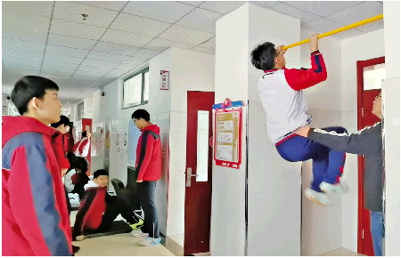 该校党总支书记张开明定下两条铁律:体育课不能占,学生的课间时间不能占。走廊里的运动设施,就是专门为初中生装的,尤其是毕业班的孩子。“把器械搬到孩子身边,把十分钟的碎片时间用起来。不用专门抽时间训练,下课就能练。”张开明说,这些零碎的运动时间攒起来,学生的体能提升肉眼可见。