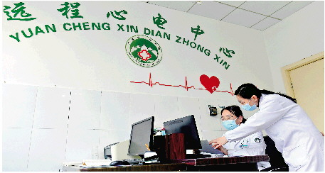 3月15日,在日照市五莲县人民医院远程心电中心,医师通过乡镇卫生院传来的心电图进行诊断。山东省深入推进医疗卫生强基工程,基层诊疗能力、服务环境实现全面提升。 新华社发