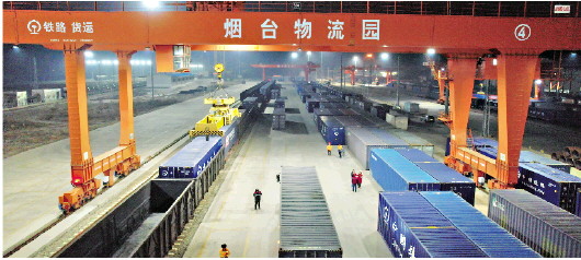 城市还在沉睡中,山东济铁烟台物流园内一片繁忙,“福山—广东”班列整装待发。 王建鸿 摄