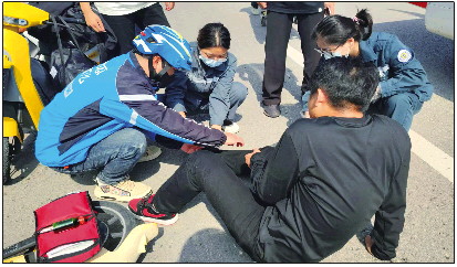 骑手于龙则是队伍里的“应急先锋”,两次挺身而出的经历让他成为市民口中的“急救侠”。2025年2月6日,和平南路一处垃圾桶突发火情,引燃周边气瓶,在狂风助势下火势迅速蔓延,于龙途经此地,立刻逆着人流冲向火场,一边拨打119,一边组织群众疏散、掘土设置隔离带、借水扑灭火源。经过近半小时的奋战,成功遏制了火势扩散。“以前遇到险情只会着急打急救电话,现在有了专业技能,能真正帮上忙,心里特别踏实。”于龙的话,道出了所有队员的心声。
