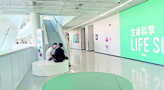 西湖大学学术环走廊,两名学生正在讨论问题。
