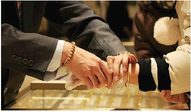 消费者在金店试戴金饰。受金价波动影响,黄金产品受关注。 资料图