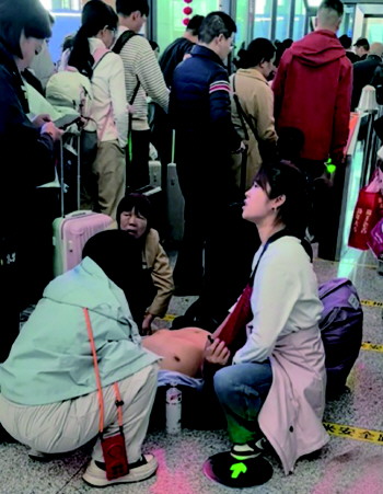 高铁站一男子突发晕厥,李洋(右一)立刻展开规范处置。