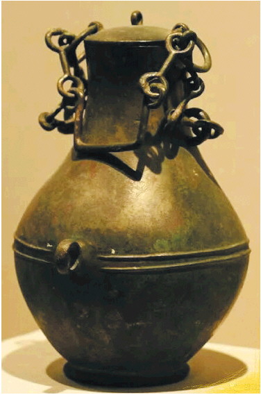 铜壶通梁高44厘米,器高29.7厘米,口径8.5厘米,腹径19.6厘米,足径10厘米,重2.8公斤。口圆形,配盖,盖中央有做工精巧的环形钮,以铜环将壶身与提手连接。这种提链壶一般都具有水器匝的功能,与盘组合使用,因此有理由判定是盛酒器。壶颈较长,腹部鼓起,中段饰有两道凸弦纹。矮圈足,腹部一侧有一环鼻。