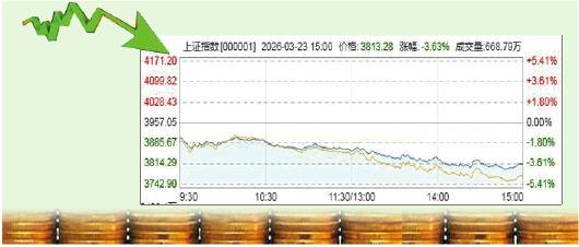 3月23日,在中东局势持续紧张、全球股市集体承压的背景下,A股市场迎来了一场深度调整。三大指数低开低走,午后跌幅虽有所收窄,但仍以全线重挫收盘。上证指数盘中一度失守3800点整数关口,全市场近5200只个股下跌,超百股跌停。