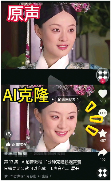记者在相关平台检索发现,短视频、广告配音、有声书等领域,AI生成内容已占相当比例。这些合成音频数量庞大,且呈现出规模化趋势。配音演员的声音被当作“数据资源”,被随意抓取和利用,而他们本人却往往毫不知情,更无法掌控这些声音的用途与传播范围。过去需要专业录音棚和大量样本才能完成的语音克隆,如今借助开源模型和少量音频素材即可实现。部分网络平台甚至提供“声音复刻”服务,用户只需上传数分钟的人声素材,便可生成可调用的AI语音模型,侵权门槛被大幅降低。