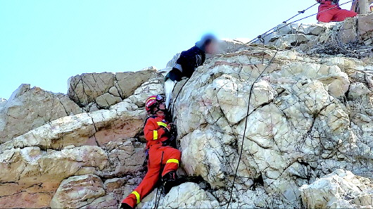 一名经验丰富的消防员沿绳索平稳垂降,慢慢靠近被困小伙,帮助他穿戴好安全吊带。考虑到小伙体力透支、情绪紧张,消防员主动贴近岩壁,用自己的肩膀作为支撑点,让小伙踩在上面借力向上攀爬。一步、两步……在消防员的托举和绳索的双重保护下,被困小伙最终成功抵达山顶,化险为夷。