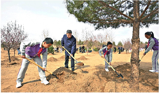 挥锹铲土、培土围堰、提水浇灌……习近平接连种下油松、北京牡丹、榆叶梅、杜仲、元宝枫等多棵树苗。他一边植树,一边询问孩子们的学习生活、劳动锻炼和参加植树情况。习近平强调,青少年像小树苗一样充满活力和希望,要从小树立远大志向,爱知识、爱劳动、爱自然,德智体美劳全面发展,努力成长为栋梁之材。现场气氛热烈,一派繁忙景象。