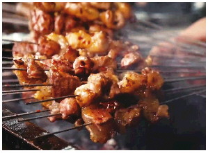 “炙”字古意直白,火上置肉便是。先民猎得兽肉,撂进火堆,火舌舔舐,焦香混着肉腥漫开,无需精巧炊具,不必繁复调味,最原始的热力逼出食材本真滋味。《齐民要术》里炙法很多,藏着古人对烟火的讲究。“貊炙,全体炙之。以铁叉贯羊,周而复始炙之,涂豉汁、蜜”,读之仿佛看到北魏厨子蹲在陶炉边,把整羊串在枣木杆上,慢慢转动,隔一会儿,用木勺舀着豆豉混蜂蜜的酱汁往上浇,羊皮被烤得透亮,裹着层琥珀糖衣。“涂豉汁、蜜”,简单几个字中,藏着老祖宗的味觉门道。