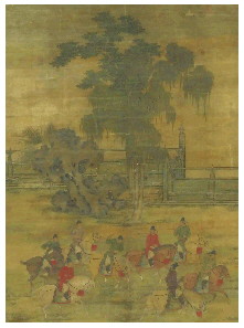 《八达春游图》是五代后梁画家赵嵒的传世名作,此画现藏于台北故宫博物院。赵嵒喜绘画,尤工人物,格韵超绝。善画人马,俊挺有气格,但流传至后世的画作甚少。《八达春游图》的画面以八位头戴官帽、身着红紫官服之人纵马游春为主线,将清明时节的生机与闲适融为一体。画面中,垂柳依依,草木新绿,一块灵石点缀其间,与八匹神骏矫健的马匹形成动静对比。画家以细劲的线条勾勒人物与马匹,马匹错落有致,或轻步,或嘶鸣,或低头,姿态各异,仿佛能听见马蹄踏过草地的轻响。八位骑马者或顾盼召唤,或挥鞭督行,衣冠端庄却神情轻松。这幅画不仅是对春日游宴的记录,更是五代时期文化与自然审美交融的见证。