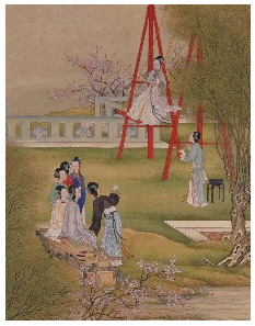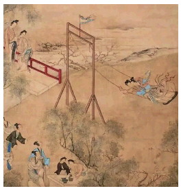 同样是描绘荡秋千的场景,清代宫廷画家冷枚的《荡秋千》则呈现出另一番热闹景象。冷枚是山东胶州人,擅长人物,兼通山水、花鸟,作品融合西洋透视技法与传统工笔,风格工整妍丽。《荡秋千》中仕女衣袖流线自然、色彩清新雅致,秋千之上两位女子裙袂翩翩,宛若仙女降临人间,充满了动感与活力。与陈枚的宫廷题材不同,冷枚的《荡秋千》更贴近市井生活,女子的笑容与姿态透露出清明时节民众的放松与喜悦。冷枚作为融合中西技法的宫廷画家,其笔下的秋千之戏既保留了传统仕女画的柔美,又通过色彩与构图的创新,赋予画面更强的现实感,成为清代清明题材绘画中的一抹亮色。